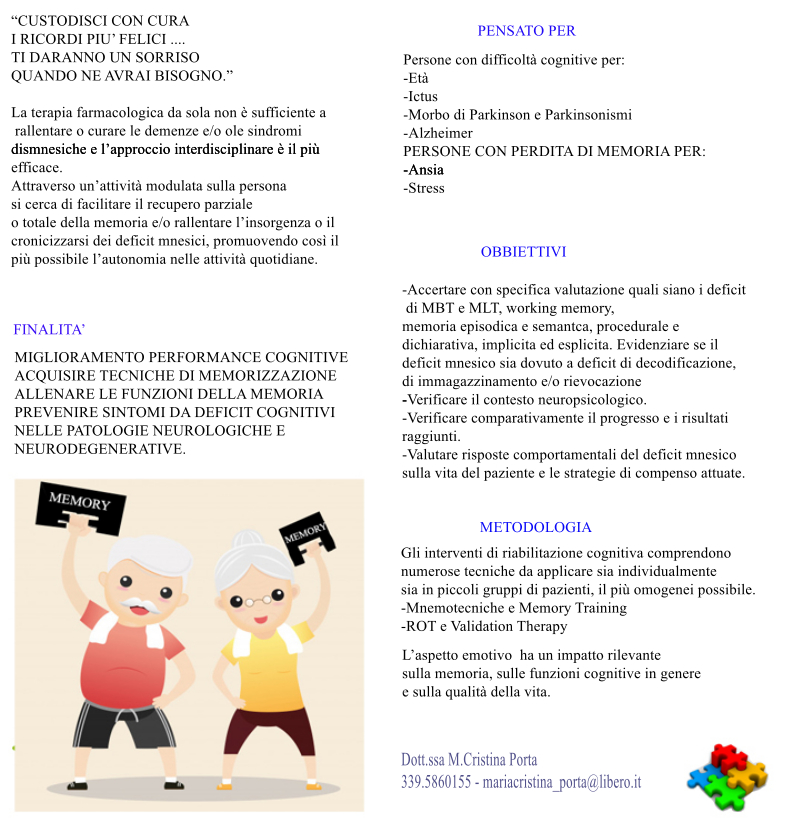 Mi ha detto: “Se un anziano ha indolenzimenti muscolari va a fare fisioterapia. Se ha indolenzimenti della memoria, dicono che è l’età. E lasciano peggiorare. Qualcosa si può fare”. Il corso offre esercizi ed indicazioni per la riabilitazione della memoria.