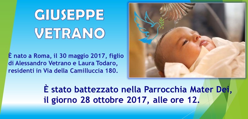 E' stato battezzato dal parroco, don Flavio Peloso, nella chiesa Mater Dei, il 28 ottobre, alle ore 12.