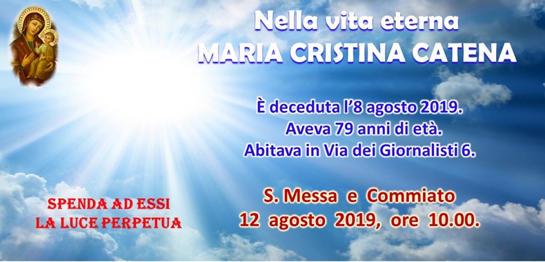 Celebriamo la Messa di commiato cristiano nella chiesa Mater Dei, lunedì 12 agosto, alle ore 10.