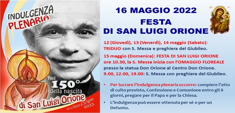 16 maggio (Lunedì): FESTA LITURGICA DI SAN LUIGI ORIONE. Alle Messe delle 9.00 e delle 18.30 c'è la preghiera del Giubileo.